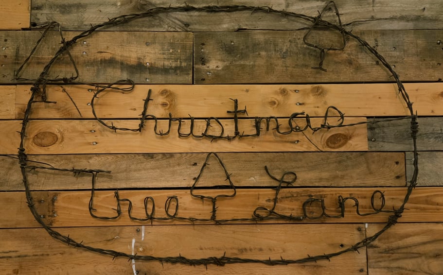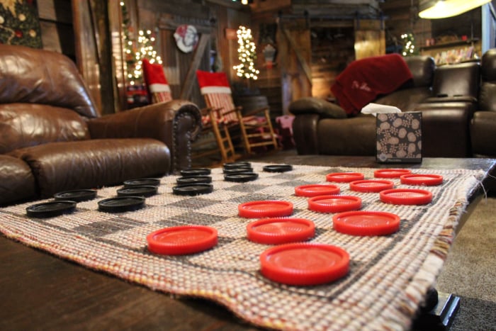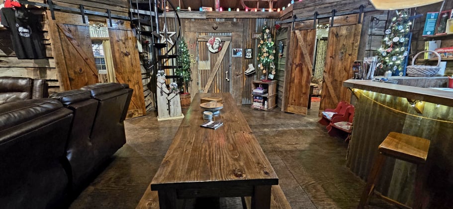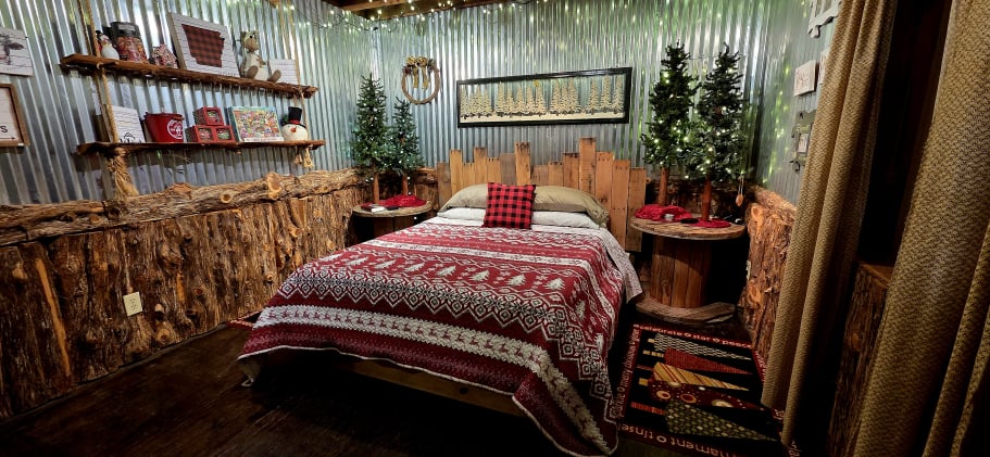 The décor is intentionally rustic — barn wood, metal accents, and winter‑themed touches that celebrate the season all year long.