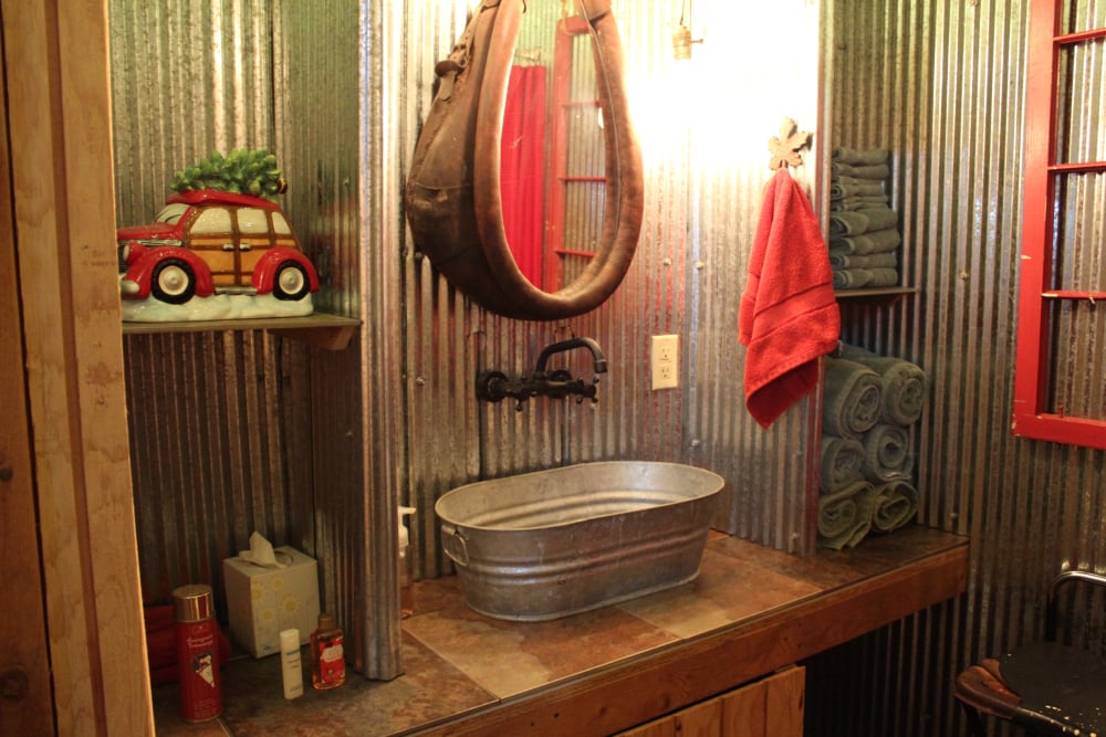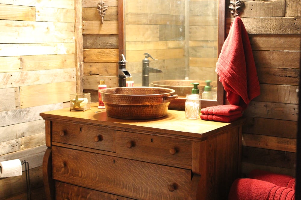 - A warm, rustic living area with barn wood, vintage sleds, ice skates, and winter décor